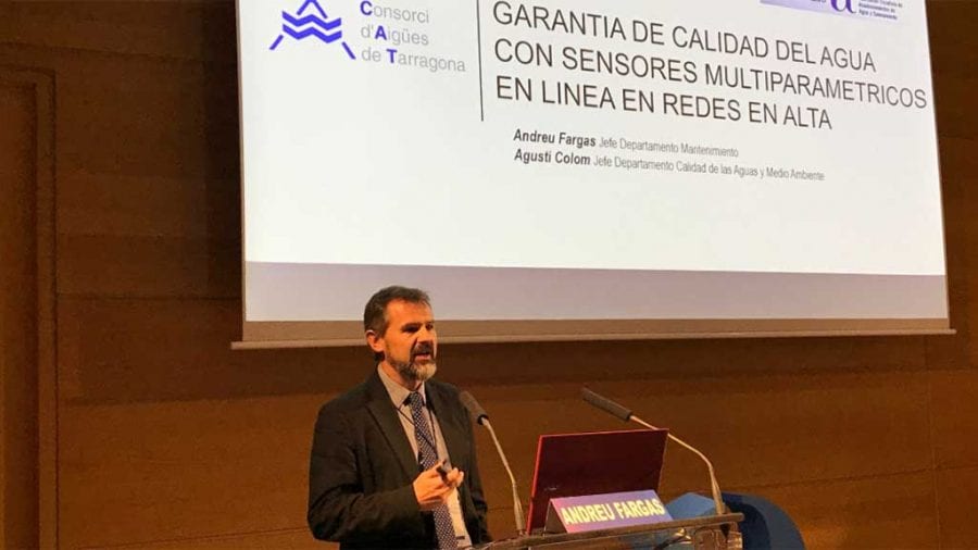 Enguany el CAT, a través de la ponència “Garantia de la qualitat de l’aigua amb sensors multiparamètrics en línia en xarxes en alta” pronunciada pel cap del departament de manteniment, Andreu Fargas, ha explicat el desplegament de 17 sensors multiparamètrics a implantar a la xarxa de distribució del CAT en el període 2017-2020, complementat amb 5 desplegats en col·laboració amb EMATSA, per cobrir la totalitat de l’aigua distribuïda. Aquests sensors mesuren conductivitat, terbolesa, índex UV 254nm, color, TOC i temperatura i són un dels eixos principals d’acció del Pla Estratègic 2018-2021 pel que fa a la millora de la qualitat de l’aigua. La ponència d’Andreu Fargas és una de les 86 que es presenten aquests dies a València.