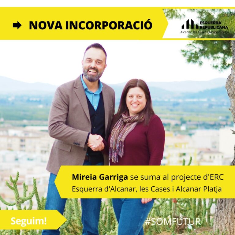 L’alcalde d’Alcanar i candidat a la reelecció per ERC, Joan Roig, ha fet pública aquest dimarts la incorporació de Mireia Garriga a la la seva candidatura per a les municipals del 28 de maig. Sense definir encara quina serà la seva posició a la llista, Roig ha presentat la Mireia com “arquitecta amb despatx propi des de 2009. Experiència en l’àmbit de l’arquitectura, també en el sector públic. Formada a l’Escola Tècnica Superior d’Arquitectura de Barcelona. Un perfil idoni per a gestionar les àrees vinculades a urbanisme, patrimoni i serveis”, afegia, donant a entendre que està destinada a llocs de sortida.