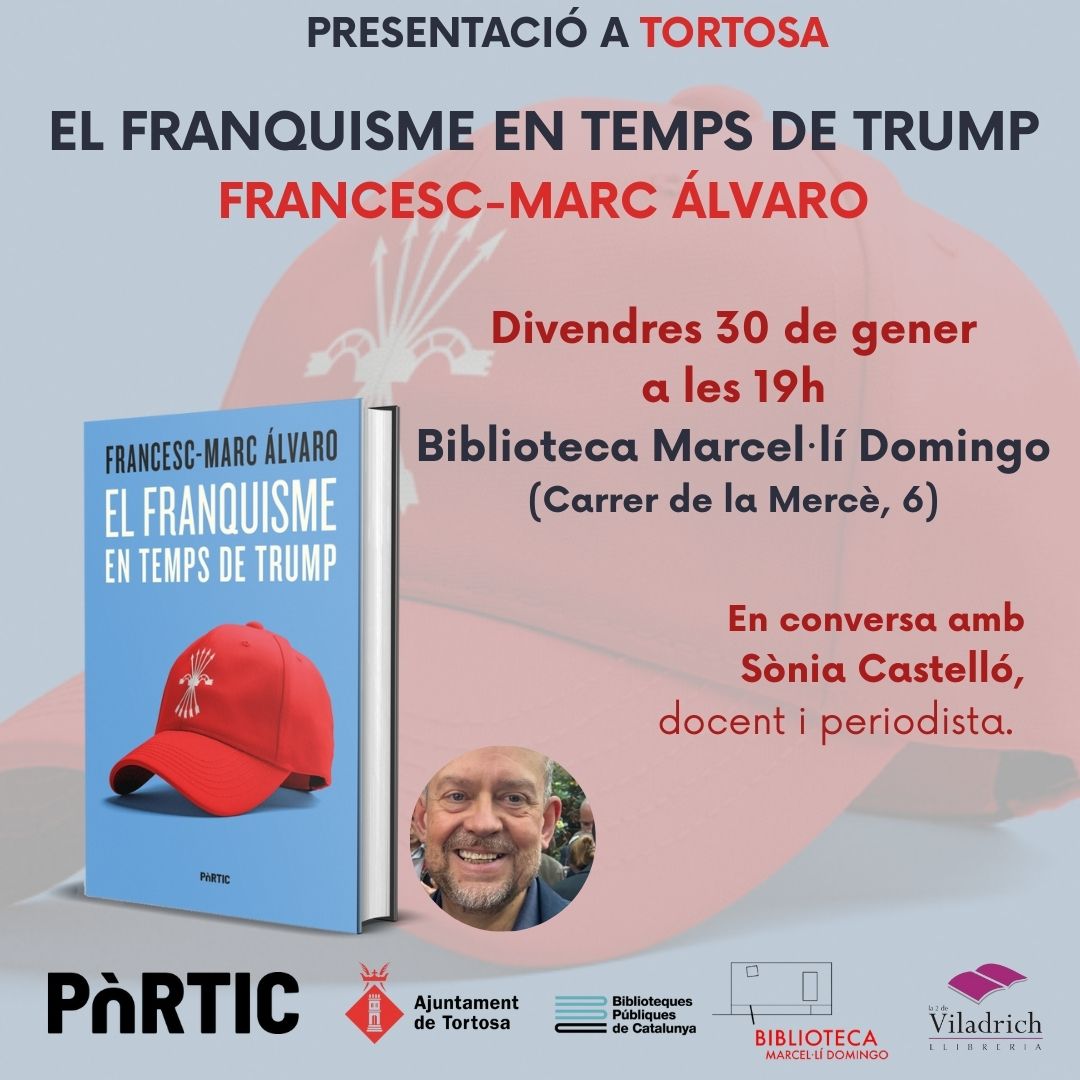 La Biblioteca Marcel·lí Domingo de Tortosa acollirà aquest divendres (19 hores) la presentació del llibre ‘El Franquisme en temps de Trump’ (Pòrtic Edicions), obra de Francesc Marc Álvaro. L’autor, periodista, escriptor i professor de Periodisme a la Universitat Ramon Llull, ha dirigit la revista cultural Serra d’Or. Ha escrit diversos llibres sobre política i història i és Premi Nacional de Periodisme. Des de les eleccions generals de juliol del 2023, és diputat al Congrés espanyol per Esquerra Republicana de Catalunya com a independent.
